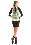 • L’abito morbido a mezze maniche che gioca sui toni del verde del bianco e del nero
