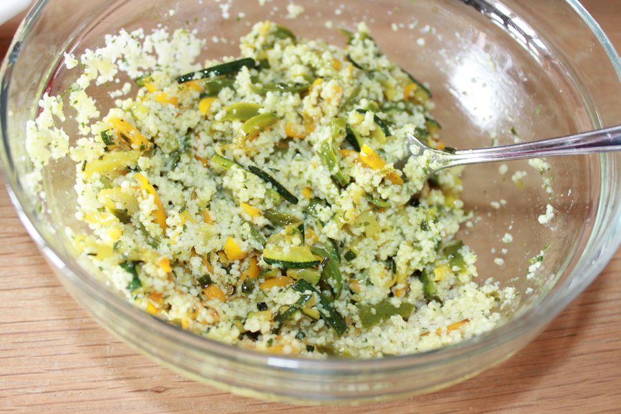 Prepariamo il cous cous seguendo le istruzioni del marchio scelto, tenete presente che in ogni caso le dosi sono comunque in parti uguali: mezza tazza di cous cous, mezza tazza di acqua, raddoppiate o smezzate in base alle vostre necessità: versiamo il cous cous in una ciotola capiente e sopra l’acqua tiepida, copriamo e lasciamo in ‘’ammollo’’ per 5 minuti o secondo la tempistica segnalata sulla confezione.
