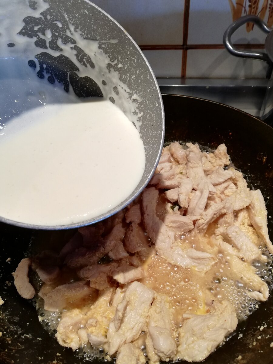 Prendiamo i filetti di petto di pollo e affettiamoli a striscioline piuttosto sottili, saltiamoli velocemente in padella antiaderente a fiamma vivace e poi aggiungiamo metà del quantitativo di panna e continuiamo la cottura, a fine cottura avremo il pollo morbidissimo e dal sapore dolce. A questo punto prepariamo la salsa al taleggio versando il taleggio che avremo tagliato a cubetti piccolissimi in un pentolino a sponde alte antiaderente e a fiamma bassa iniziamo a scioglierlo, aggiungiamo la panna avanzata e proseguiamo la cottura aiutandoci con una frusta da cucina per eliminare gli eventuali grumetti che si sono formati. Per ultimo aggiungiamo il parmigiano e terminiamo la cottura lasciando intiepidire. Teniamo a portata di mano un paio di cucchiai di latte nel caso il taleggio si ‘’attacchi’’ al fondo del pentolino per evitare che bruci.